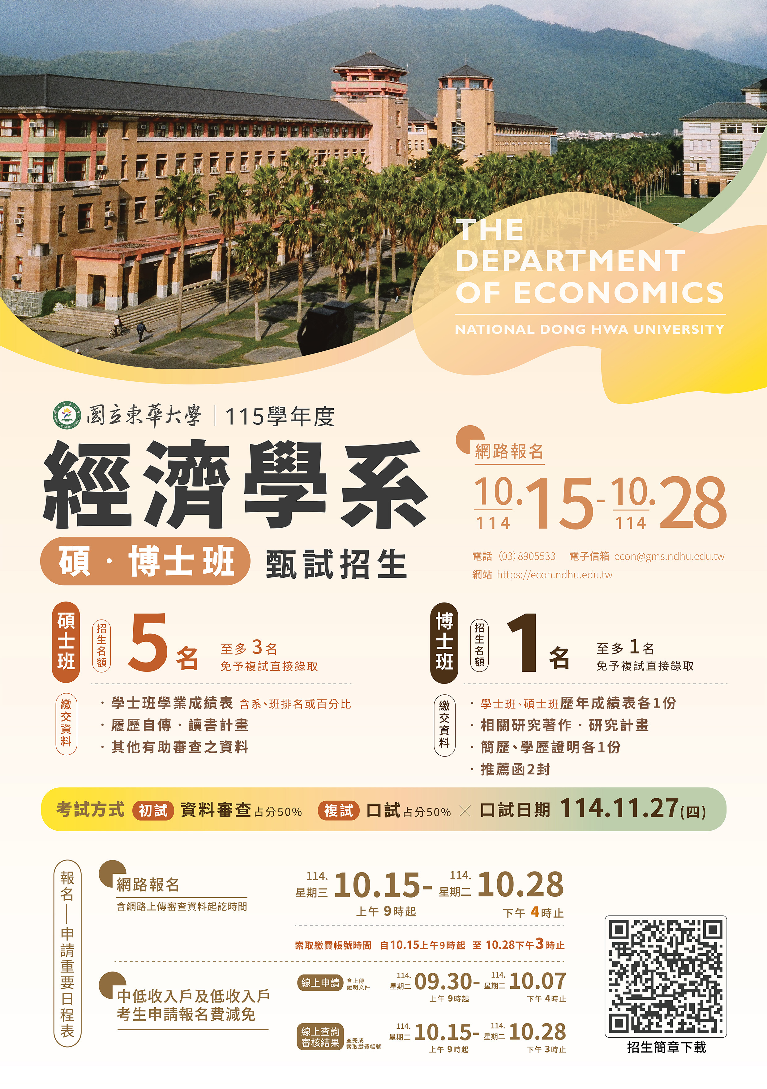 3. 國立東華大學經濟學系教學助理助學金暨工讀金作業細則(TA):碩士班學生可應徵教學助理。