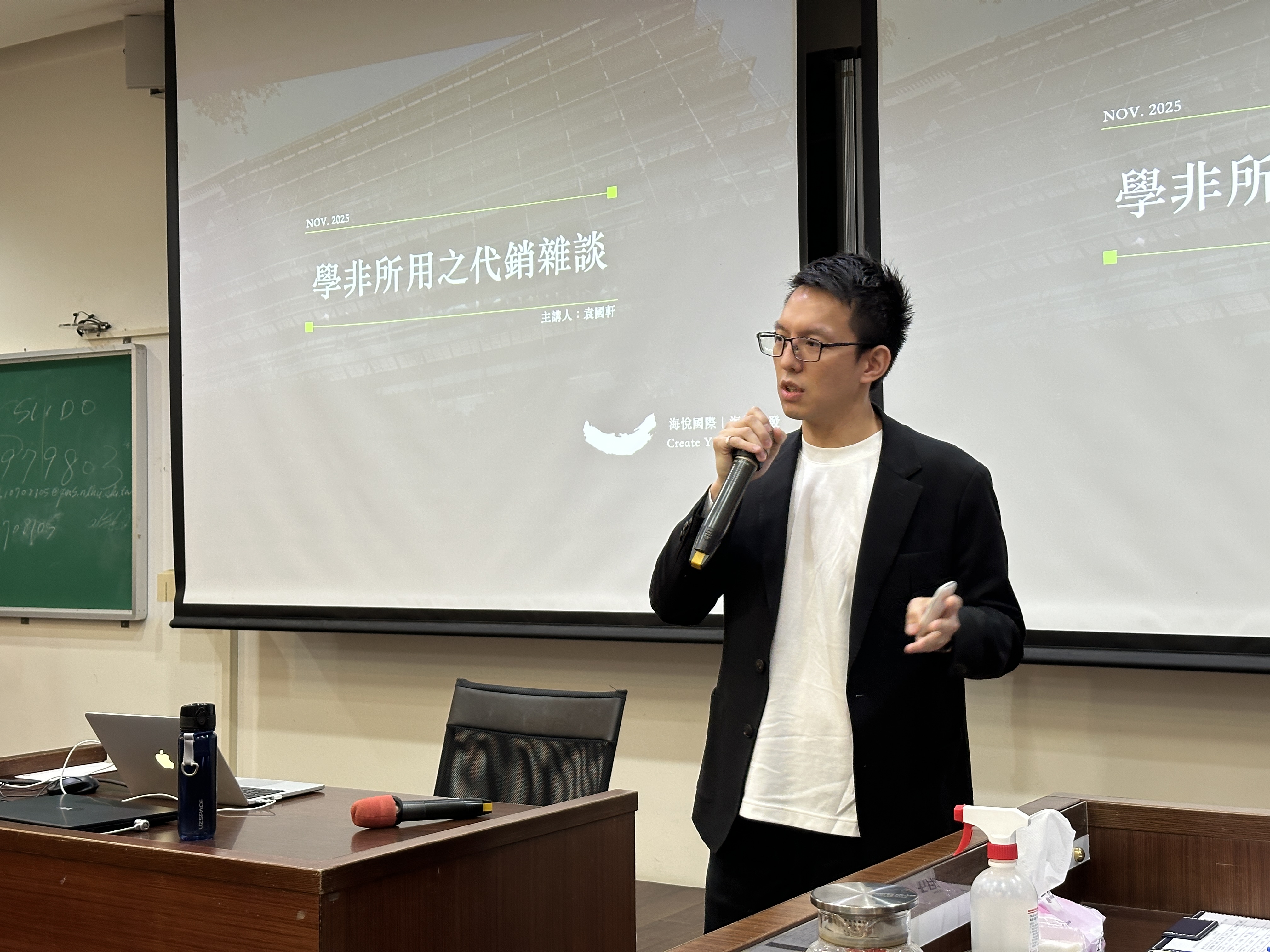 第二場演講於114年11月21日舉行,由具十年以上經驗的代銷業從業經驗的海悅機構海鉅開發業務部資深經理袁國軒系友以「學非所用之代銷雜談」為題分享房地產推案流程與產業實務。講師從自身職涯談起,說明代銷工作的核心包含市場分析、產品定位、接待與銷售策略,並以服務對象、區域屬性、標的種類、量體規模、客層樣貌、規劃流程、銷售方式與工作模式來介紹代銷與仲介之間的差異。袁國軒系友也強調,代銷產業需具備耐心、溝通能力與市場敏銳度,要有積極、熱情與犧牲奉獻的精神,獨立思考發現問題與解決問題的能力也同樣重要,讓學生們更了解房地產產業的運作模式、從業的必備證照與個人特質。最後,講師以「人生是一趟無法回頭的旅行,本該盡情的體驗與嘗試」,鼓勵同學們不要害怕未知,要有接受挑戰的勇氣,做好準備盡最大的努力不留遺憾。